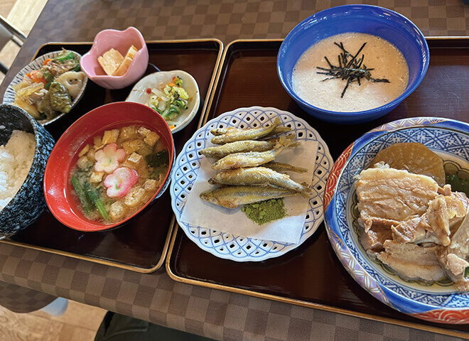 久留里城の駐車場の中にある森林体験センターの中にある和食堂。木材をふんだんに使った天井が高く広々した店内で、地元の名産が楽しめる。写真は千葉のもち豚、久留里の本モロコ、小糸の自然薯を使った殿様御膳。駐車場が広いのはもちろん、味も良い。久留里の豆腐など地産のスイーツも。